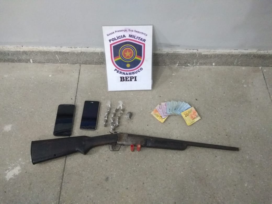 Durante as buscas na residência, foram apreendidos 16 big-bigs de maconha, 02 cartuchos calibre 32, dois celulares e uma quantia em dinheiro. Em um terreno baldio, uma espingarda calibre 32 foi localizada. O ex-presidiário assumiu que a arma era sua.