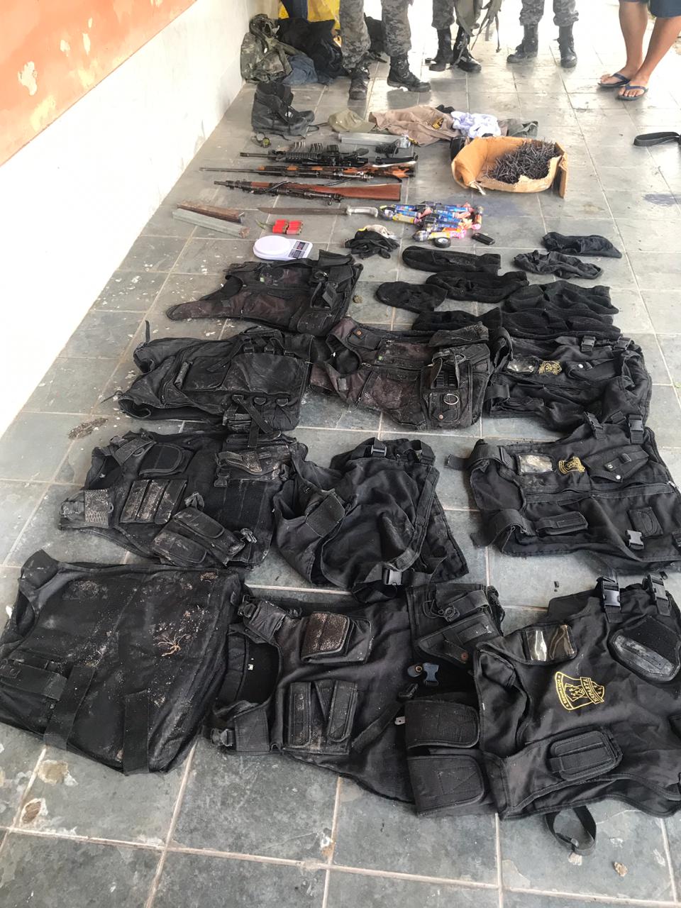 No total, foram apreendidos com o trio quatro fuzis 5,56, dois fuzis 7,62, uma pistola calibre .380 e outra 9mm, cinco balaclavas, seis pares de placas de colete balístico com capas, quatro capas de coletes sem placas, grande quantidade de grampos usados por bandidos em fuga para furar pneus de viaturas, um uniforme da PMPE, 12 artefatos de explosivos, uma Hilux, uma Frontier e uma Pajero.