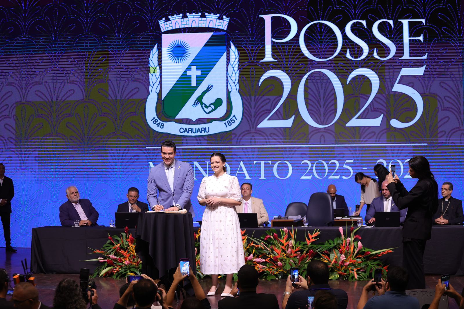 O prefeito reeleito de Caruaru, Rodrigo Pinheiro (PSDB), e a vice-prefeita Dayse Silva (PSDB) tomaram posse na tarde desta quarta-feira (1º), em cerimônia realizada no auditório do Senac, na Capital do Agreste. A solenidade ocorreu após a eleição da nova mesa diretora da Câmara Municipal, que escolheu o vereador Bruno Lambreta (PSDB) como presidente. Rodrigo, que conquistou 102.198 votos no último pleito, ressaltou em seu discurso os desafios e compromissos para os próximos quatro anos de gestão.
